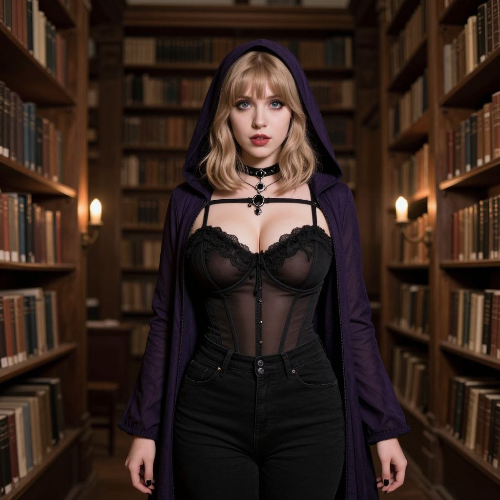 A college-aged woman with soft blonde hair and expressive blue eyes wearing a gothic-themed costume outfit with black high-waist jeans, a sheer black corset top, and a long dark hood, standing inside an old abandoned library with towering bookshelves and dim candlelight.. The woman has big tits and cute face