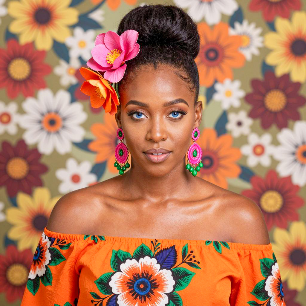 Photograph of a Black woman with dark skin and long black hair. She wears a large, colorful floral sombrero and a vibrant, embroidered red and green top. Her makeup includes red lipstick and bold red eye shadow. She has large, ornate gold earrings with red tassels and a matching necklace. Her expression is neutral. The background is solid teal. The woman is centered in the frame.