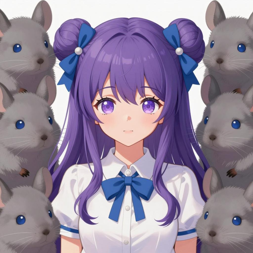 Digital anime-style illustration of a girl with long purple hair styled in double buns with blue bows, purple eyes, and a white shirt with a blue bow. She is surrounded by multiple gray chinchillas with blue eyes. The artwork features vibrant colors and a detailed anime aesthetic with soft shading and delicate facial features.