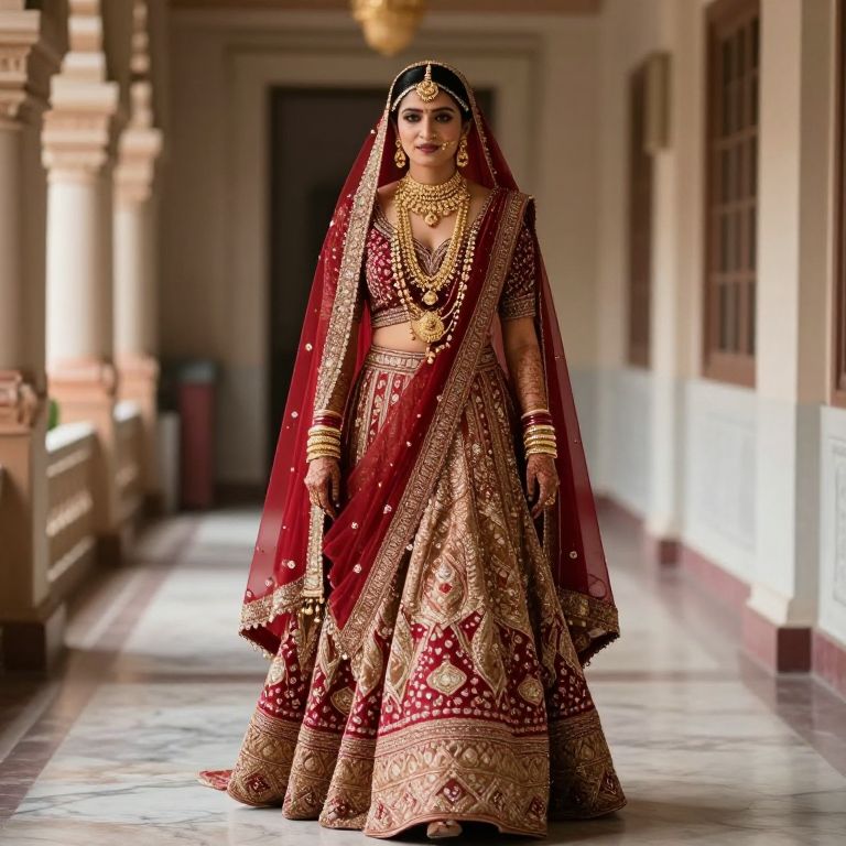 Photograph of a South Asian bride in a red and gold traditional lehenga with a sheer veil, ornate jewelry, standing in a sunlit,