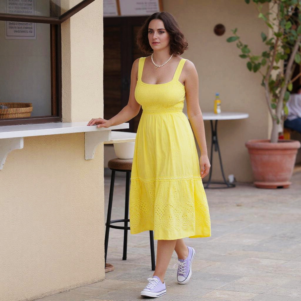 A woman in a bright yellow sleeveless midi dress, paired with light purple low-top sneakers, walking by a takeout counter in a quaint village square, captured in an oversaturated film style. Sexy. Pretty face and beаutiful eyes. Big breasts