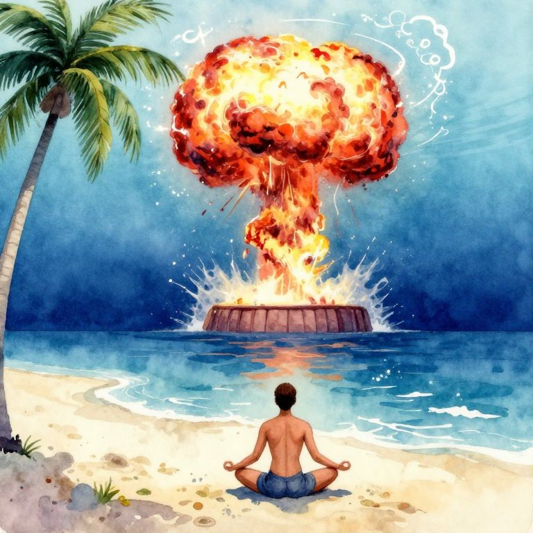 Meditation water colour painting of an underwater thermonuclear explosion, viewed from an idylic beach with beautiful palm trees.,