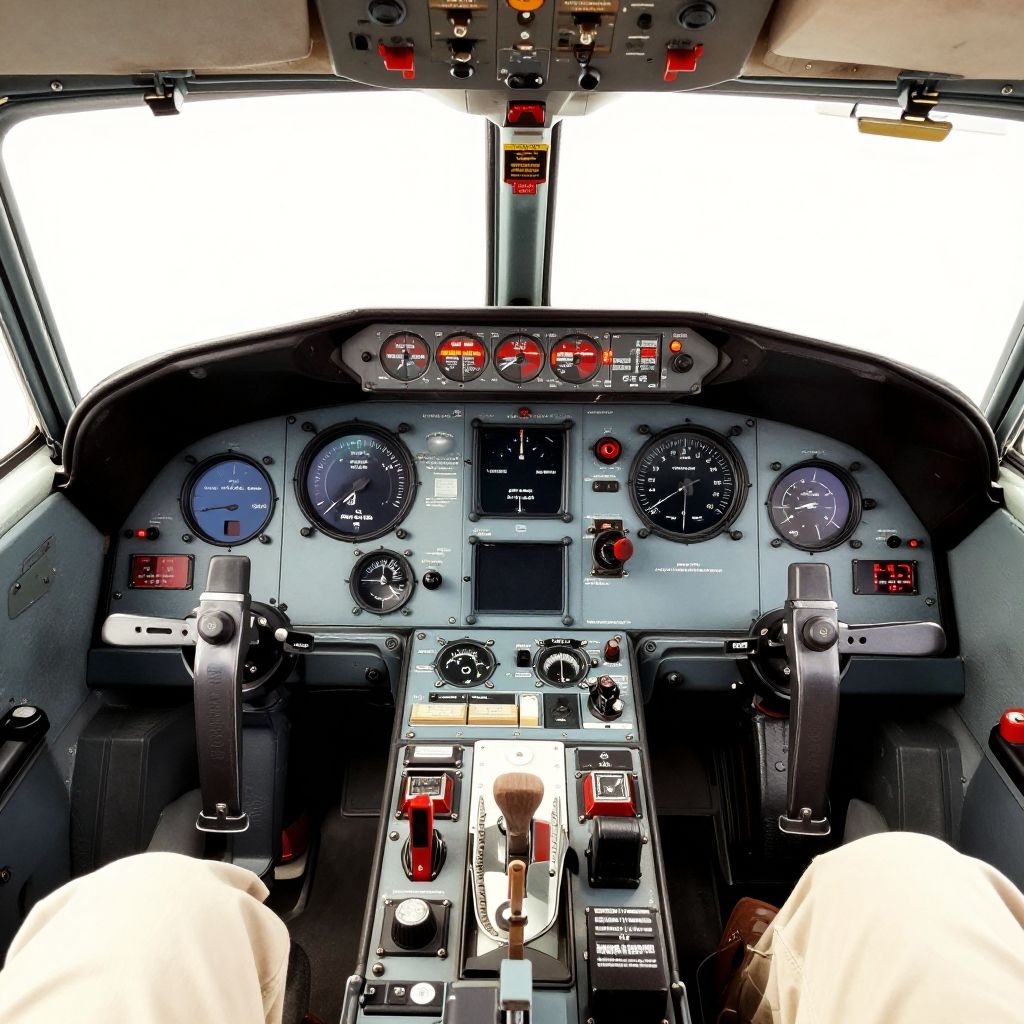 Drawn airplane cockpit view from pilot's perspective, detailed line art with focus on instruments and controls, vintage aviation theme with a nostalgic feel.