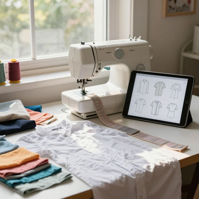 Shirt maker for free, creative workspace with a sewing machine, digital tablet showing shirt design templates, swatches of colorful fabrics and threads scattered around, cozy sunlight filtering through a window