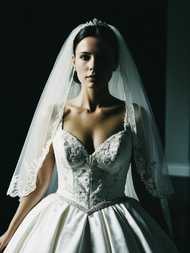 Woman in Wedding Dress, cinematic realism, dramatic bridal editorial shot