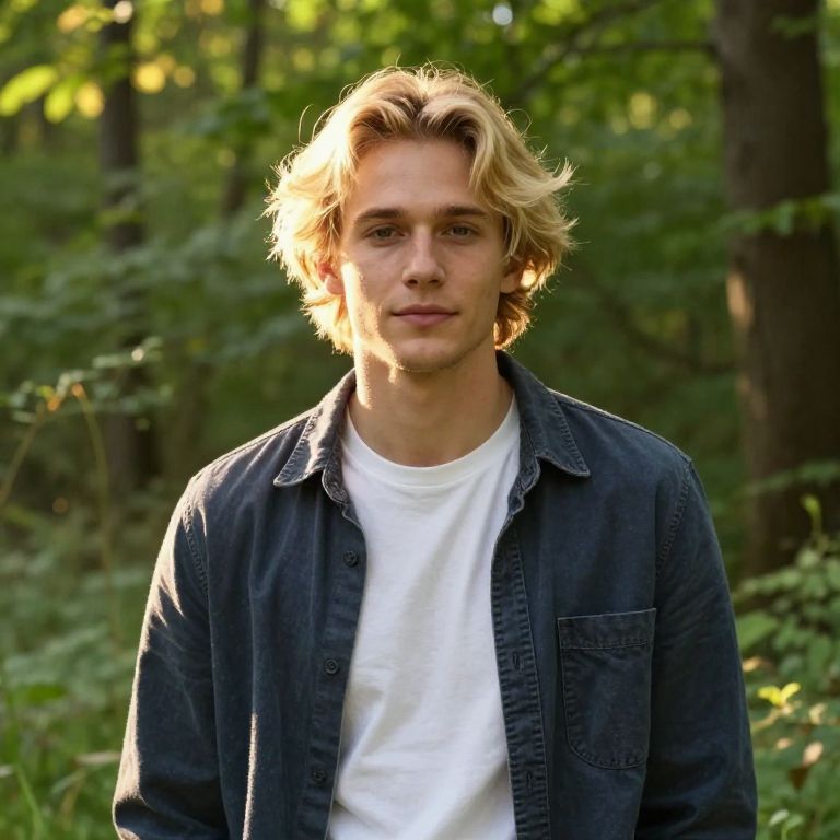Blonde hair hazel eyes male standing in a sunlit forest clearing, soft golden light illuminating his features, wearing casual modern clothes, a gentle breeze moving his hair, natural and candid portrait style, vibrant greenery background