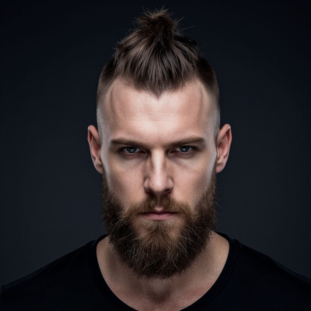 A confident man with a Viking-inspired haircut presents a striking image with his groomed beard and intense gaze, set against a moody, dark background, highlighting the bold hairstyle and rugged aesthetic.