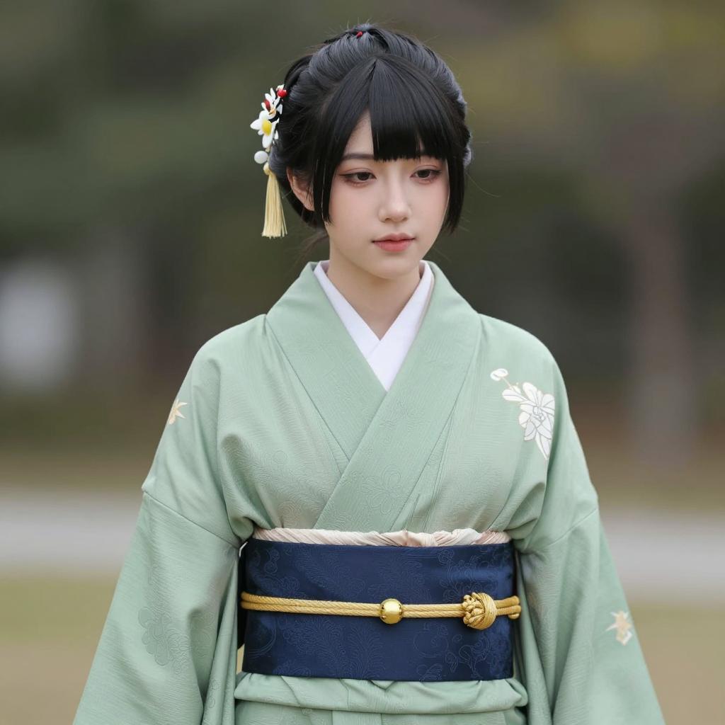 Portrait of an Asian woman dressed in a traditional light green kimono with floral patterns and a dark blue obi belt tied with a golden cord. She has neatly styled black hair adorned with ornamental floral accessories, posing outdoors with a calm and serene expression. The setting appears to be a natural park or garden with blurred greenery in the background.