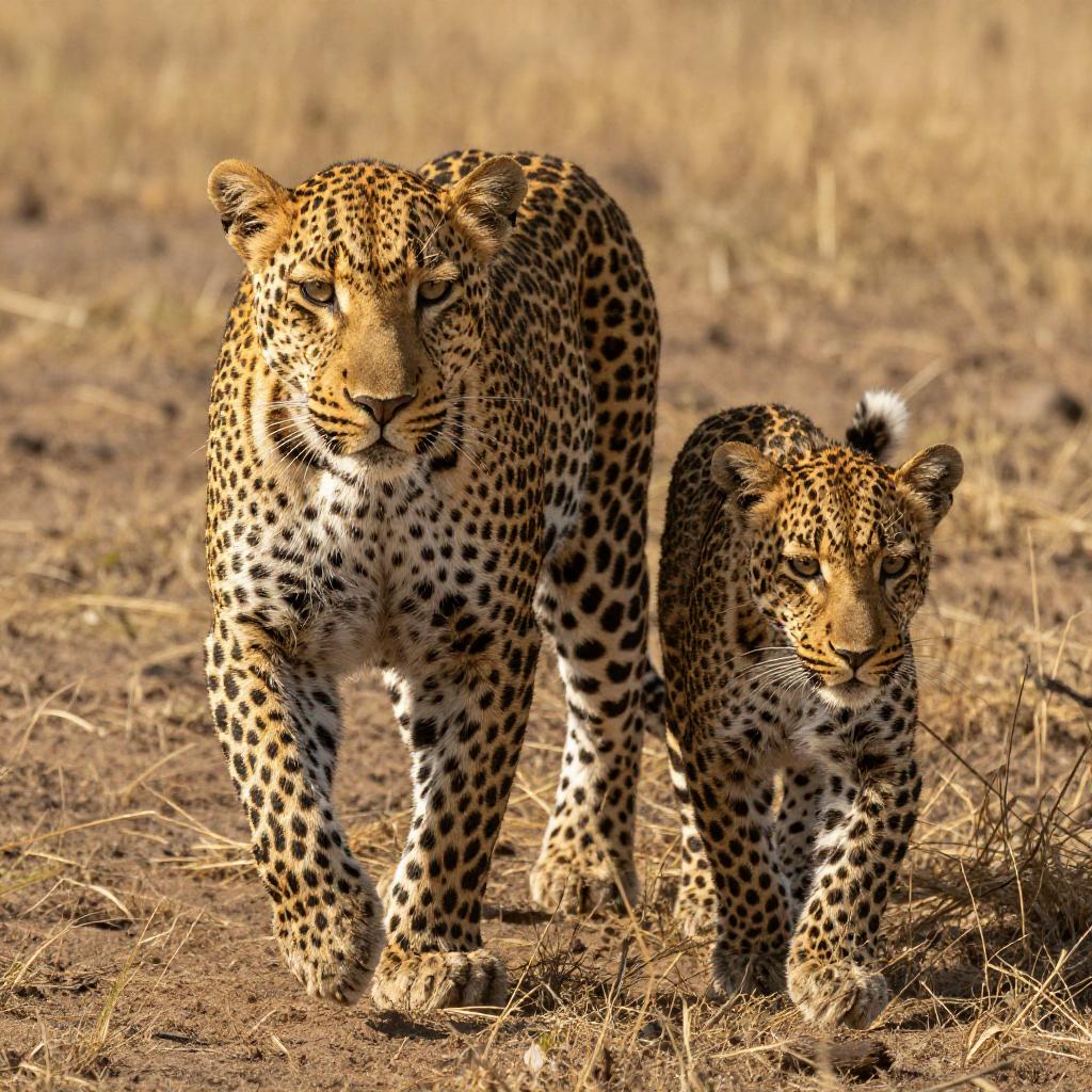 Photograph of a leopard and its cub sitting on grass. The adult leopard has a muscular build with a golden coat and black rosettes, while the cub, slightly smaller and more delicate, has similar markings. The lighting is natural, with sunlight highlighting their fur. The camera angle is slightly low, capturing both animals from the front. The background is blurred, creating a shallow depth of field that focuses on the leopards.
