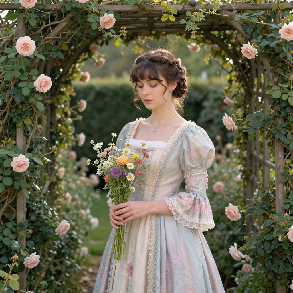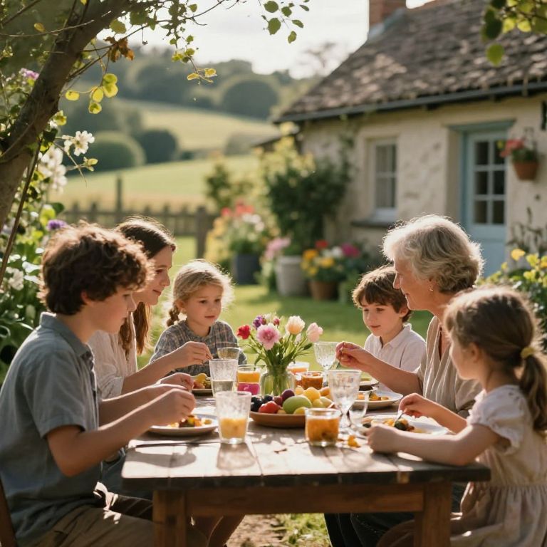 Stepmother outdoors in a garden, nurturing blooming flowers alongside children, soft pastel colors, impressionist style with focus on emotional warmth and harmony, vibrant yet gentle atmosphere
