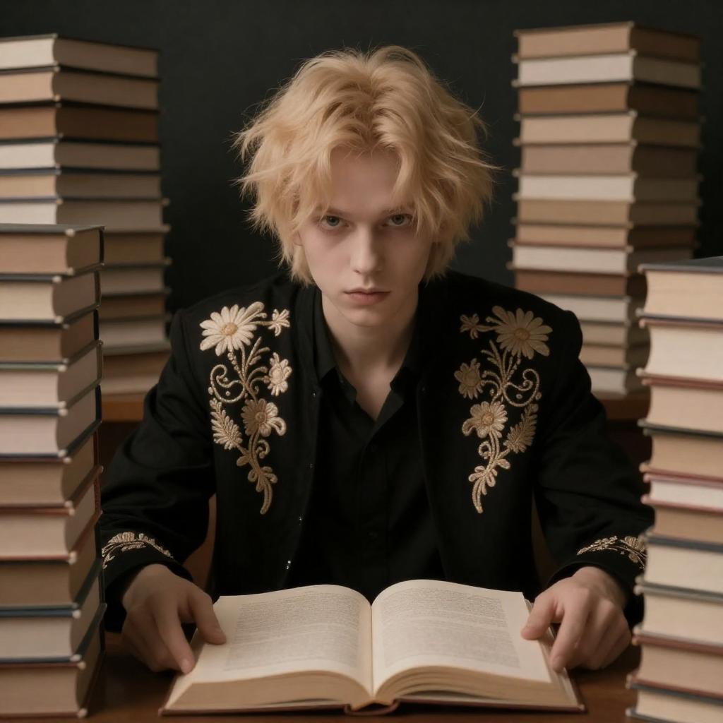 Photograph of a young person with pale skin and short, messy blonde hair, wearing a black, embroidered jacket, sitting at a table with an open book. Surrounded by tall stacks of books on both sides. Warm, dim lighting. Intense gaze. Person's face centered, book in front, stacks in background.