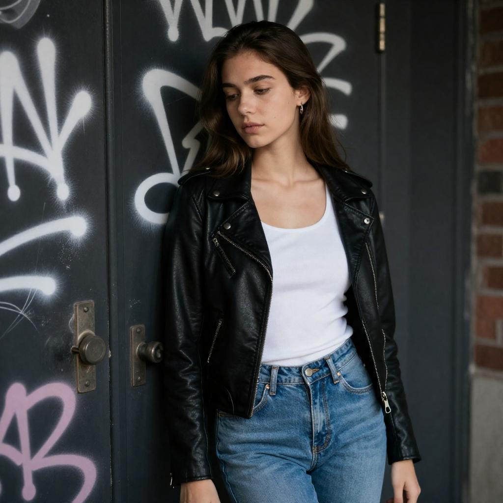 Photorealistic image of a 21-year-old woman with long brown hair and fair skin wearing a black leather jacket and black shirt, standing outdoors in an urban setting. She has a neutral facial expression, minimal makeup, and casual style, embodying a modern, casual look.