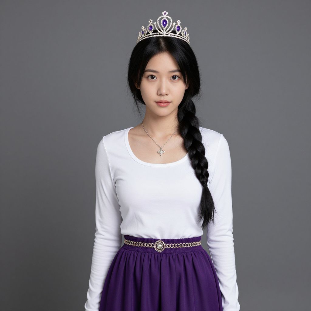 "mirabel woman costume, 1girl, solo, black hair, realistic, braid, skirt, crown, looking at viewer, tiara, long hair, long sleeves, purple skirt, shirt, jewelry, single braid Realistic photo of casual sexy person with pretty face"