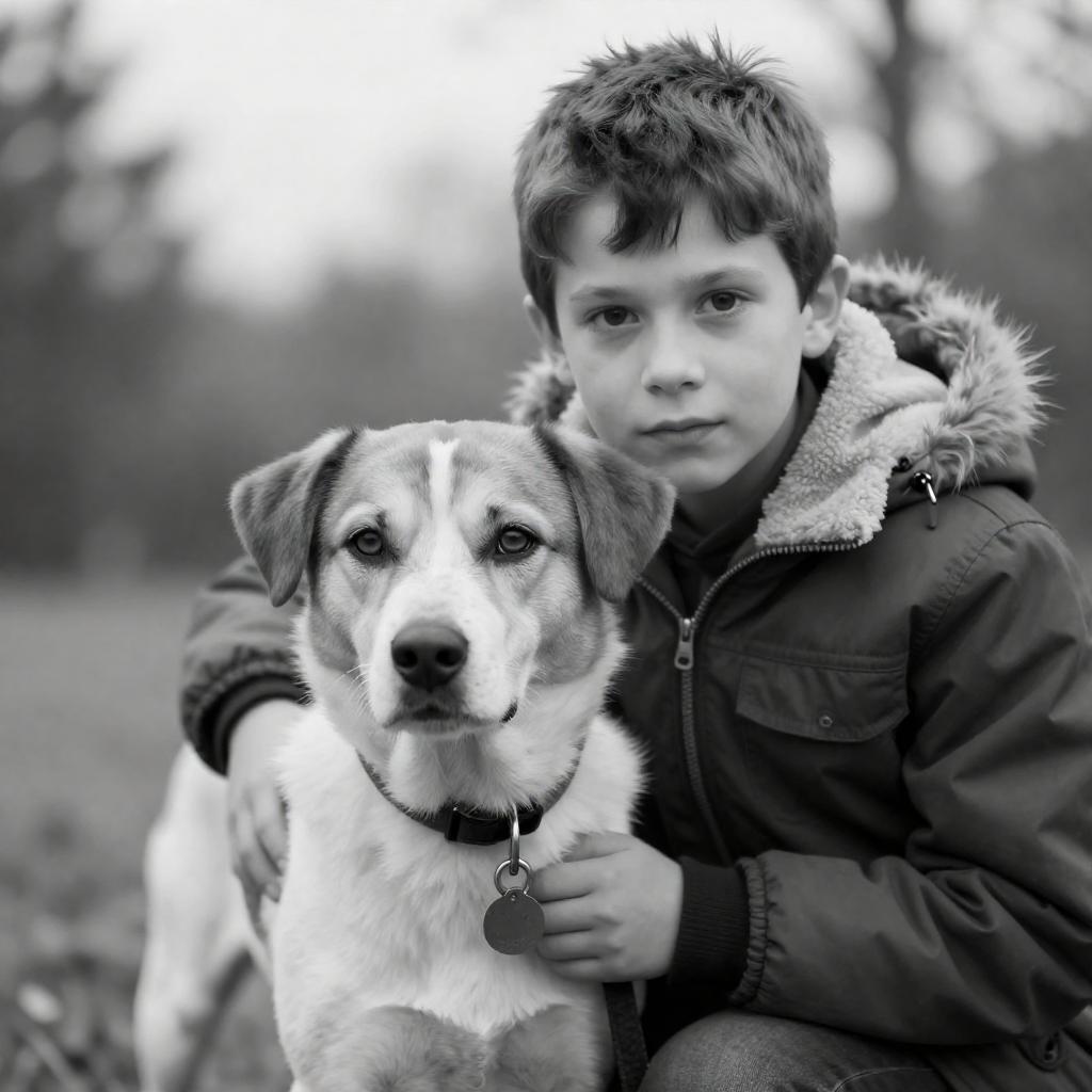 Black-and-white photograph of a young boy with short dark hair, wearing a dark jacket with a fur collar, standing closely beside a medium-sized dog with a white and brown coat. The dog wears a collar with a tag. The background is blurred with bright light filtering through trees. The boy's expression is serious, and he holds the dog's leash.