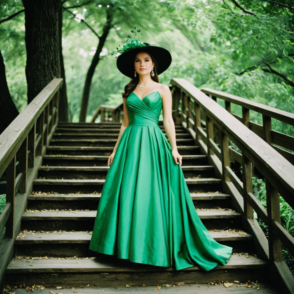 Green dress wedding,1girl, solo, dress, brown hair, tree, earrings, stairs, jewelry, hat, realistic
