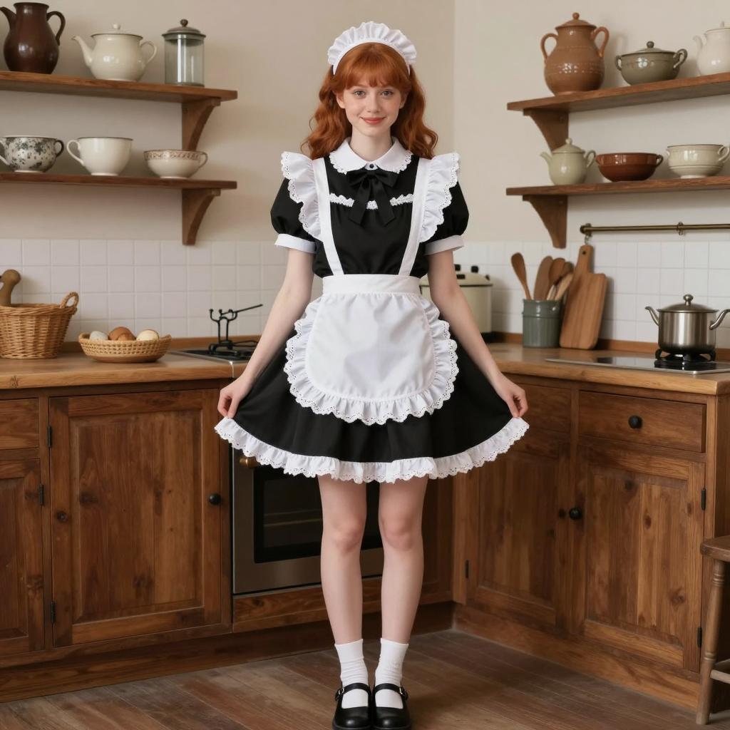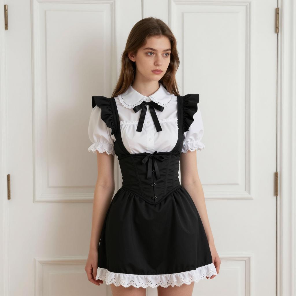 Lace maid outfit costume, photorealistic, young woman, Victorian-style maid outfit, black corset, white lace sleeves, gray skirt with white lace trim, white frilled cap, brown wavy hair, standing in vintage kitchen, soft natural light, ornate wallpaper, wooden cabinet, flowers on counter, detailed ures, realistic shadows, elegant, traditional, historical, feminine, realistic clothing details
