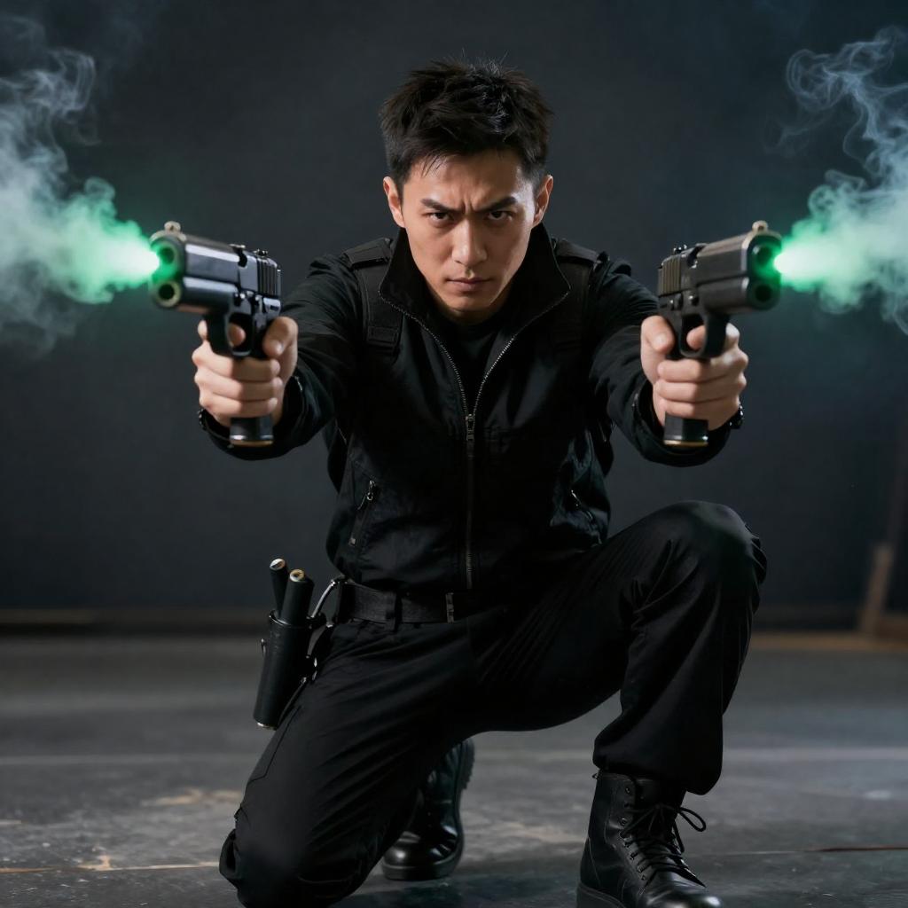 Photograph of a man with short dark hair, wearing a black jacket and pants, holding two green-lit, smoke-emitting guns in both hands. He is crouched, with a focused expression, against a dark, smoky background. The guns have visible cables.