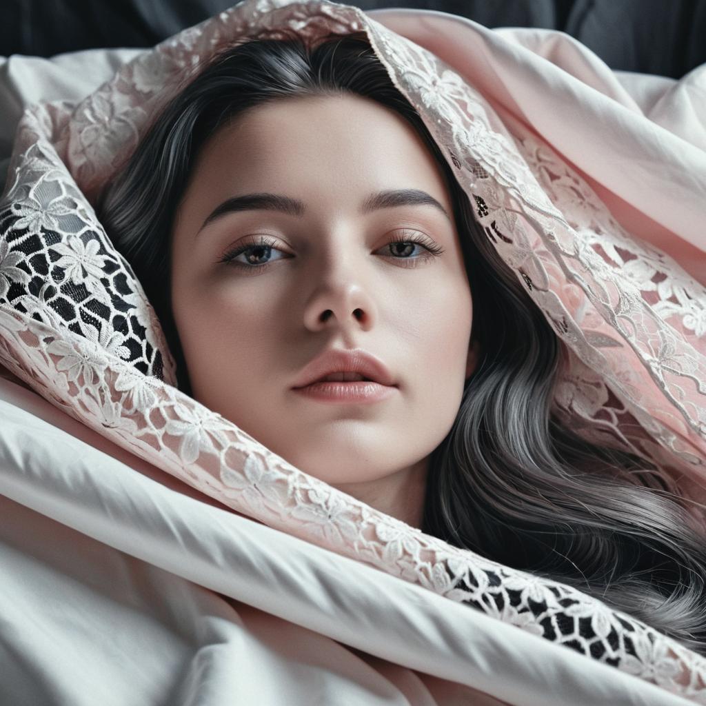 Hyperrealistic close-up portrait of a young woman with smooth skin and long dark hair, wrapped in delicate lace and flowing sheets in pearl white and pastel pink tones. The image features soft volumetric lighting enhancing the texture and softness of the fabric and the natural features of the woman's face. Artistic styling inspired by Wojciech Siudmak.