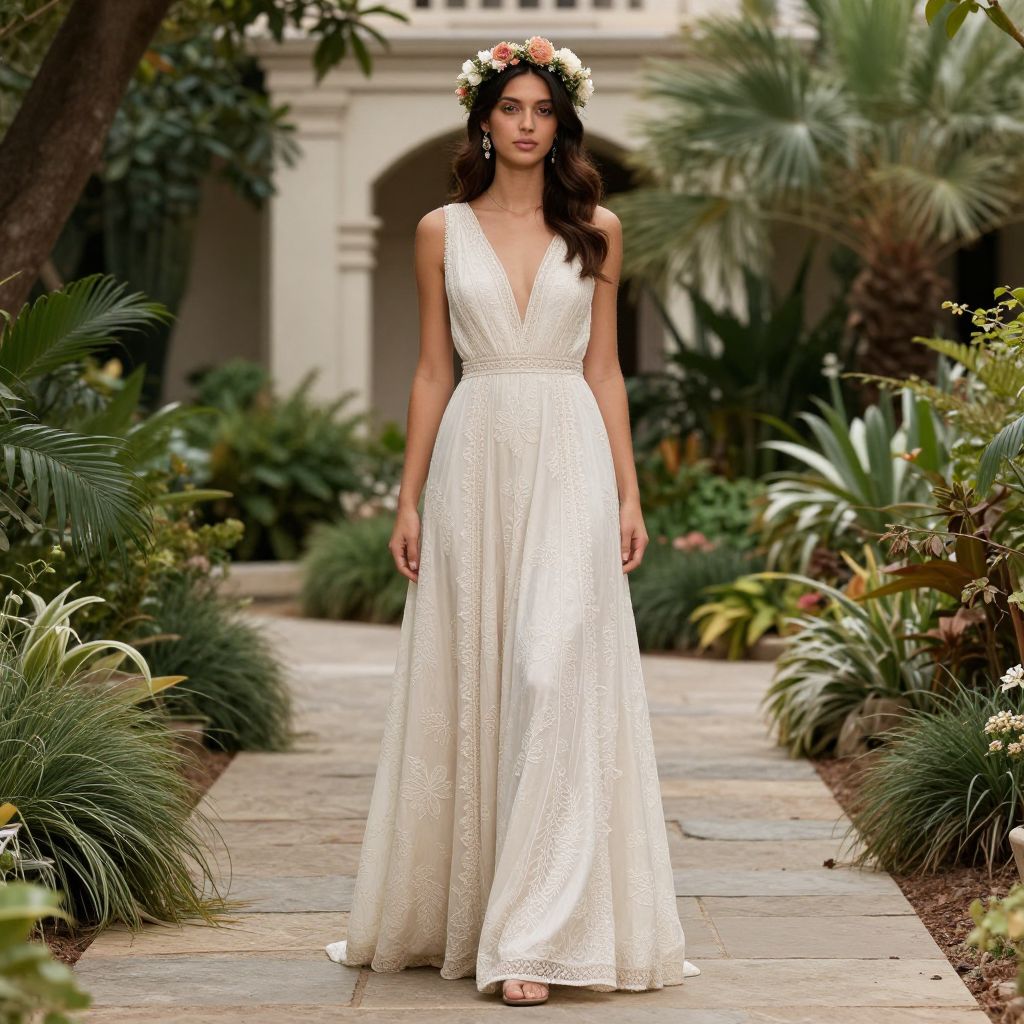 Elegant bohemian-inspired gown worn by a young woman with a floral crown, standing gracefully on a stone pathway surrounded by lush greenery and a classic architectural backdrop.