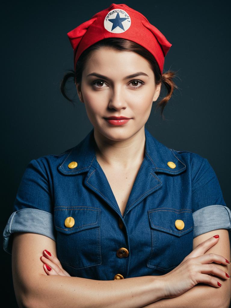 Woman in Rosie Riveter costume, professional cosplay studio headshot