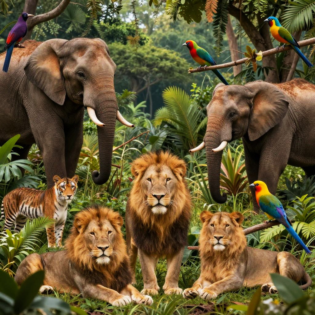 Animal picture generator creating a vibrant scene of various wild animals in their natural habitats, including lions, elephants, and colorful birds, with vivid colors and intricate details, showcasing the beauty of wildlife in a lush jungle setting.