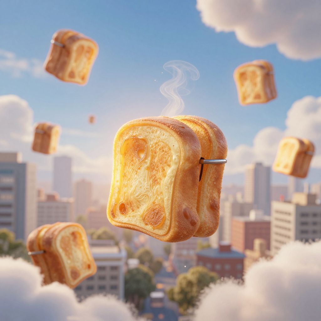 Digital art of golden, toasted bread slices floating above a sunny, cloud-filled cityscape with skyscrapers and green trees in the background.