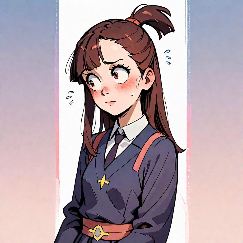 Score_9, score_8_up, score_7_up, score_6_up, score_5_up, score_4_up, NSFW, Akko, Atsuko Kagari from Little Witch Academia, petite, Lifting up her clothes to show you her body, blushing red, embarrassed, looking away nervous, partial nudity , masterpiece, show style, show accurate, flat colors, soft shading