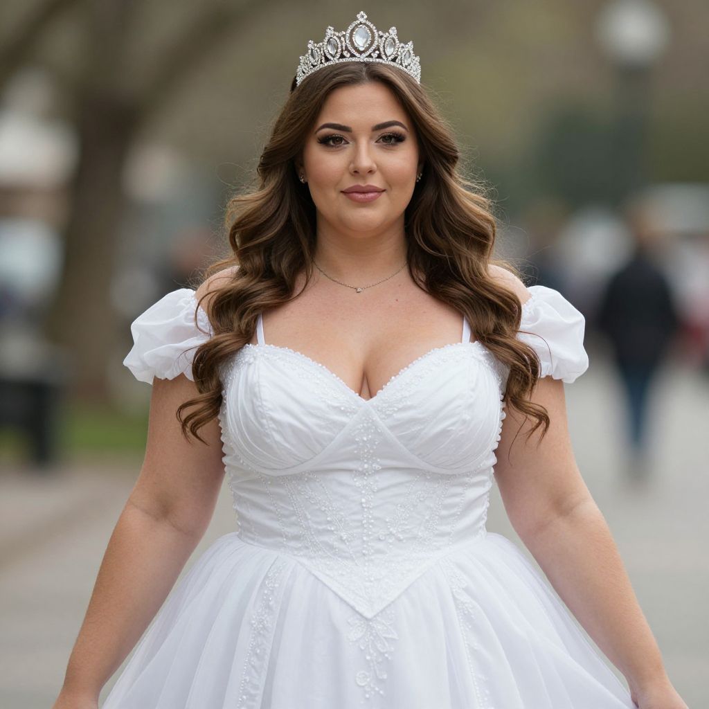 Plus size cinderella woman, 1girl, solo, breasts, dress, brown hair, cleavage, large breasts, long hair, tiara, white dress, blurry background, outdoors, looking at viewer, blurry, day, realistic