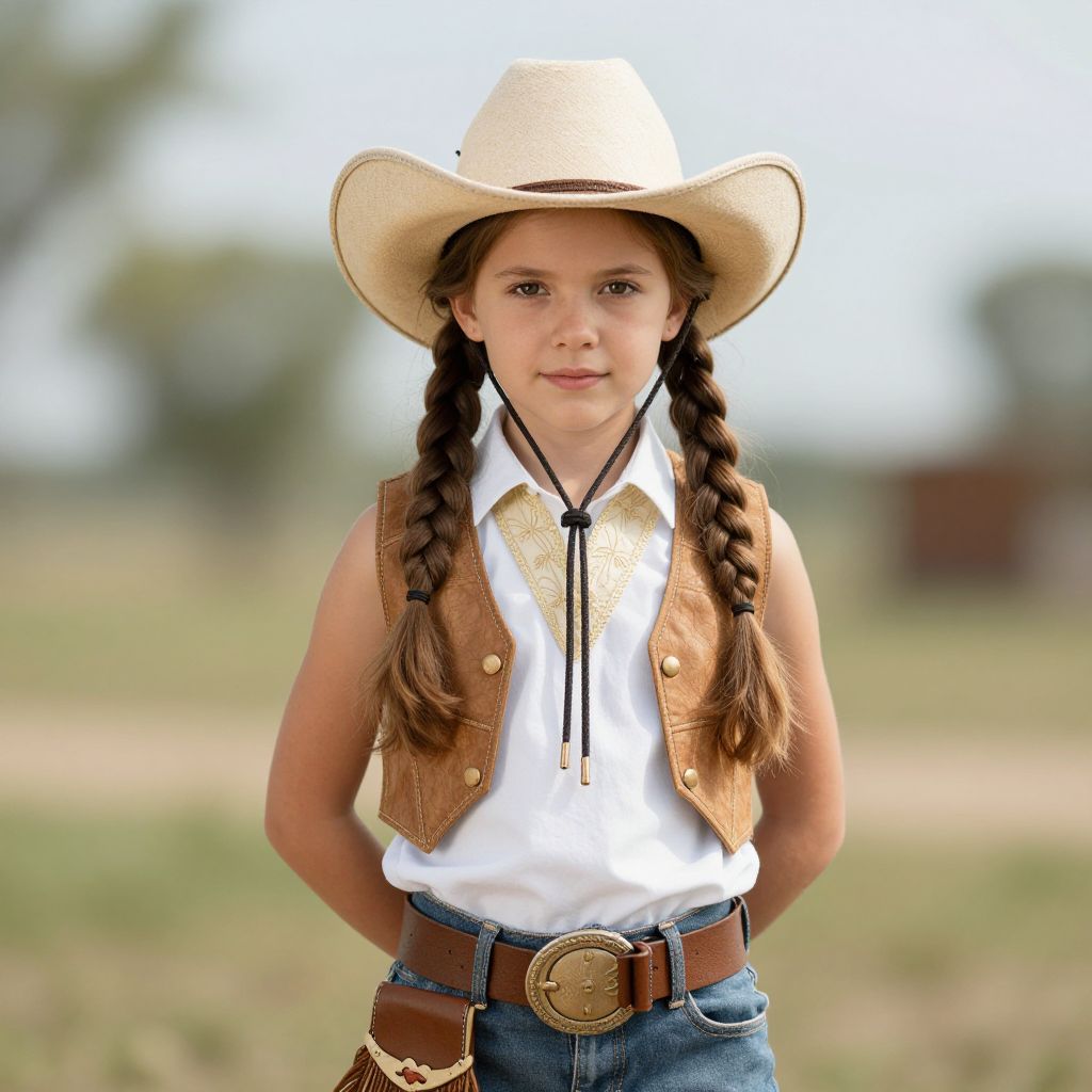 Child cowgirl costume, 1girl, solo, cowboy hat, braid, twin braids, hat, cowboy western, looking at viewer, brown hair, outdoors, belt, long hair, blurry background, vest, blurry, arms behind back