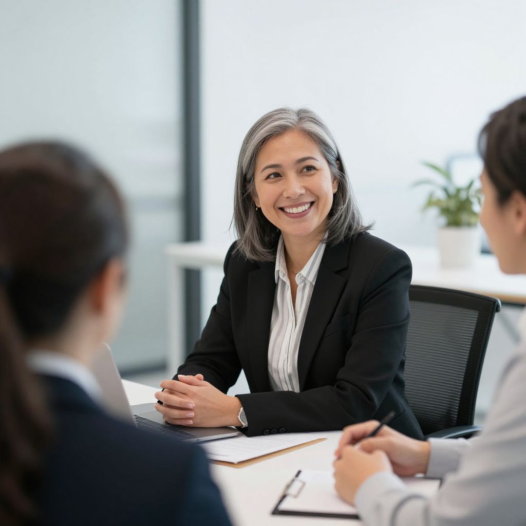 Professional woman with gray hair, wearing a black blazer over a striped shirt, smiles warmly while seated at a meeting table surrounded by colleagues in a well-lit office setting.