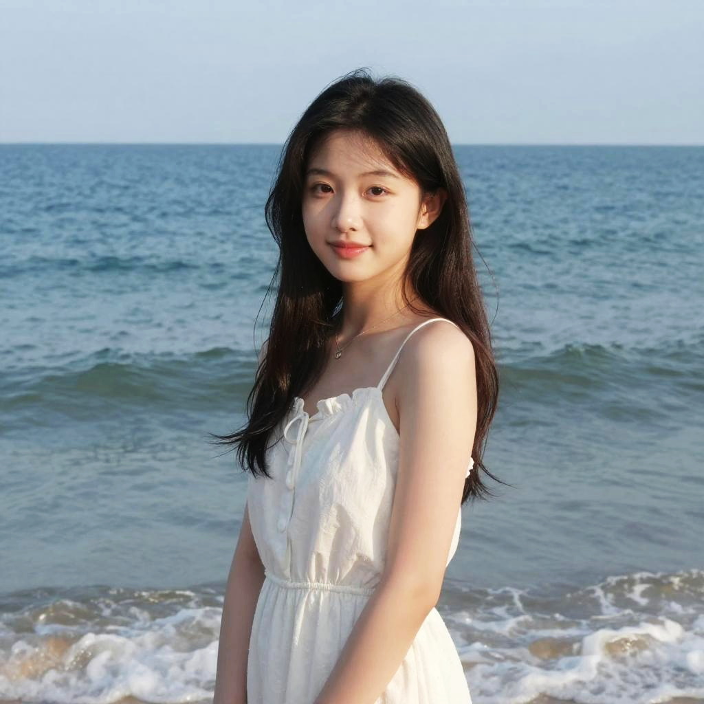 Photograph of an Asian woman with long black hair, wearing a white sundress, standing on a beach with waves in the background. Blue sky and
