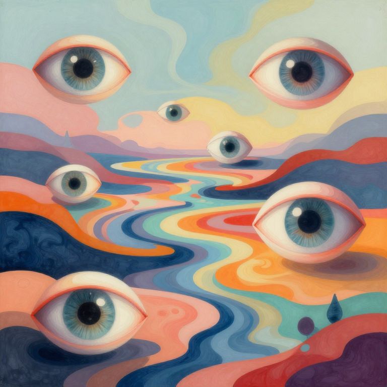 This is a vibrant, surreal digital painting featuring six floating, realistic eyes with blue irises and white reflections. The eyes are positioned at varying heights and distances across a dynamic, abstract background. The background consists of swirling, wavy patterns in bright colors including orange, pink, blue, and yellow, creating a sense of movement. A winding, multicolored river-like shape runs through the center, enhancing the sense of depth. The overall style is psychedelic and dreamlike, with smooth textures and bold, contrasting colors. The sky is light blue with hints of clouds, adding to the ethereal atmosphere.