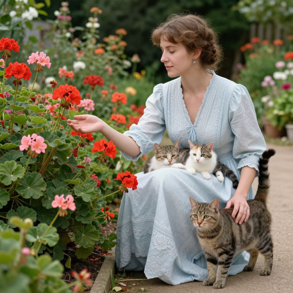 Woman seated gracefully in a lush garden, surrounded by vibrant geraniums, with two cats—one resting on her lap and the other standing beside her—while she extends her hand toward the blossoms, embodying the serene charm of Pierre-Auguste Renoir's \"Geraniums and Cats.\