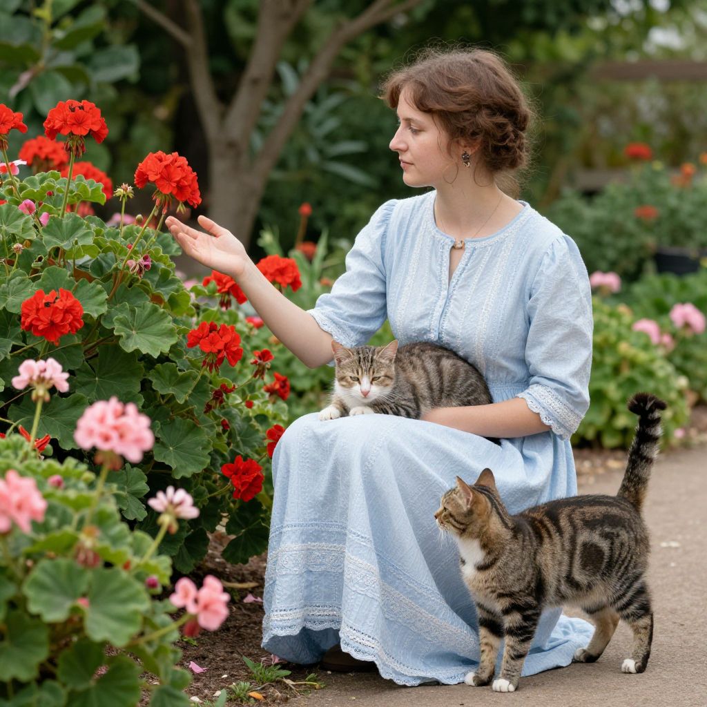Photograph of a Caucasian woman with wavy brown hair, wearing a light blue, long-sleeved, embroidered dress, kneeling in a garden. She gently touches a vibrant red geranium bloom with her right hand while holding a gray and black tabby kitten on her lap. A second tabby kitten stands attentively on the path in front of her. The background features lush green foliage, a tree trunk, and pink and red flowers. The overall scene is bright and colorful, with a serene, natural setting.