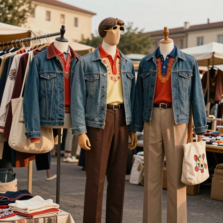 Vintage street fashion at a roadside flea market in Europe, 1960s-inspired tailoring, vintage denim jackets, embroidered polos, canvas bags, retro sunglasses, soft golden hour sun, detailed textures, authentic urban setting