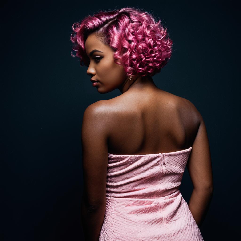 Portrait of a dark-skinned woman with bright pink curly short hair, wearing a strapless pink textured dress. She is looking back over her shoulder against a dark background, showcasing her bare shoulders and elegant profile.