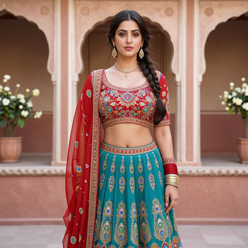 Photograph of an Indian woman with medium brown skin and long black hair in a side braid, wearing a red and gold embroidered crop top and matching red dupatta, and a teal skirt with gold and blue patterns. She has gold jewelry, including earrings, necklaces, and bangles. She stands in front of an ornate, archway-adorned building with beige walls and potted white flowers. The image has a vibrant, colorful, and traditional style, highlighting her elegant, traditional Indian attire.