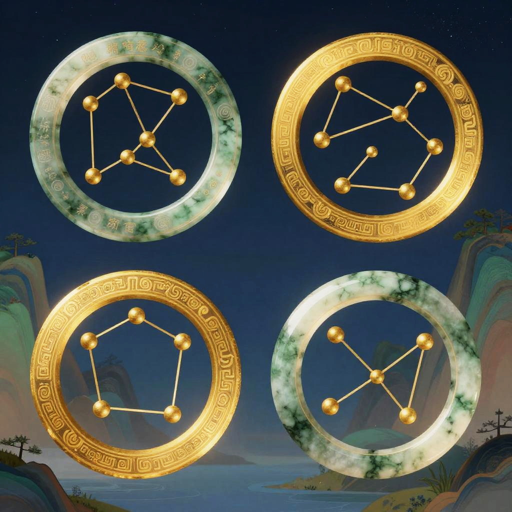 Four ancient Chinese constellation symbols rendered in gold and jade textures, floating above a mountainous landscape under a clear night sky. The symbols depict traditional Chinese astronomical motifs, with intricate circular frames featuring traditional carvings and Chinese characters. The background landscape includes stylized mountains and trees, highlighting the connection to Chinese mythology and astronomy.