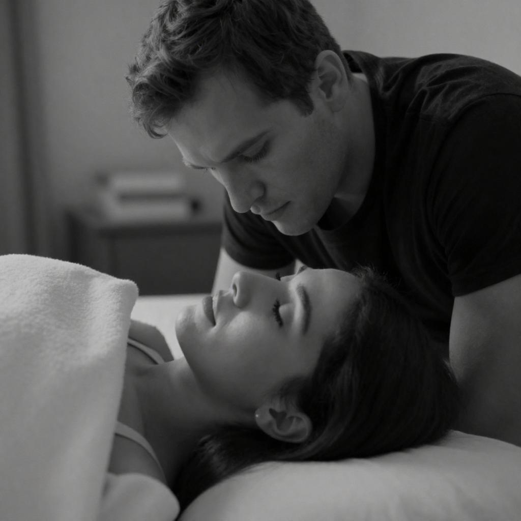 Black-and-white photograph of a couple in bed. The man, shirtless with short dark hair, leans over the woman, who has dark hair and looks upward. The man's face is close to hers. Background includes a curtain. Movie poster at bottom.