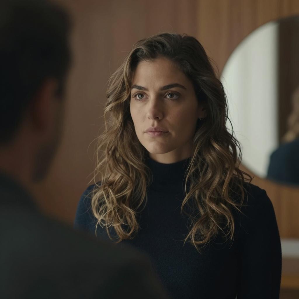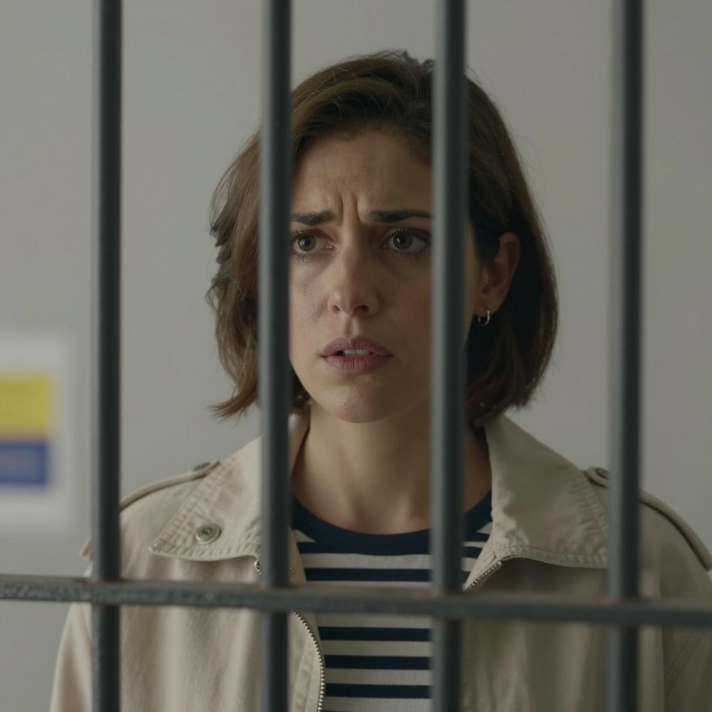 Woman with short brown hair and brown eyes behind black metal bars. She wears a beige jacket over a striped shirt. She looks concerned with slightly parted lips. Background is blurred indoor setting. Upper right ear has a small earring. Left side has a yellow and blue patch on a white object.