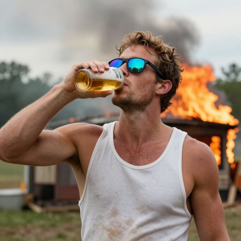 Trevor philips wearing a tank top, reflective sunglasses, drinking beer, unfazed by his house being on fire, high quality, very detailed, a beautiful photo, national geographic quality