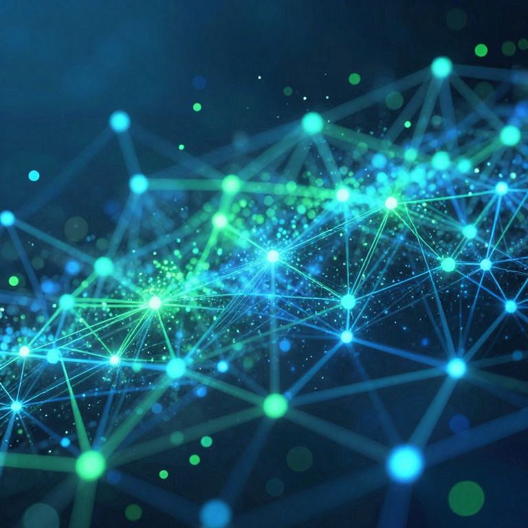 Digital artwork of a network of glowing blue and green dots connected by thin white lines, set against a dark blue background with bokeh light effects.
