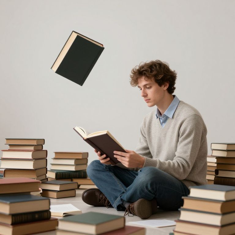 Photograph of a young Caucasian man with curly brown hair, sitting cross-legged on a white floor surrounded by scattered stacks of books. He wears a light gray sweater over a blue shirt and blue jeans. His focused expression is on a book he holds open in his hands, while another book floats in mid-air above him. The background is a clean, bright white, emphasizing the books and the floating book. The image has a magical, whimsical feel due to the floating book.