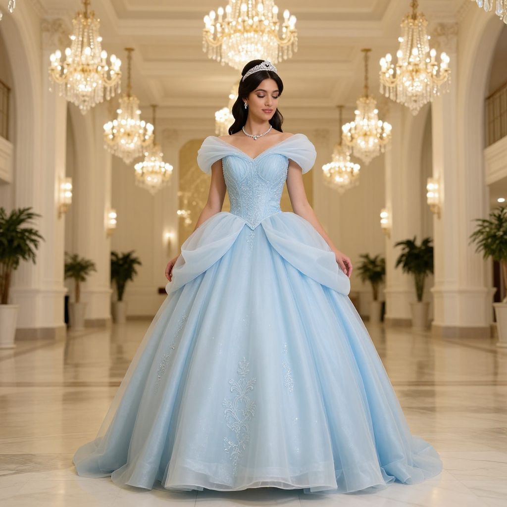 Photograph of a fair-skinned woman with dark hair in a white tiara, wearing an off-the-shoulder, light blue, floor-length ball gown with a fitted bodice and voluminous skirt adorned with delicate floral embroidery. She stands in an opulent, grand hall with high ceilings, white walls, and multiple large chandeliers casting a warm glow. The floor is polished marble, and there are tall potted plants along the sides. The woman's gaze is downward, and she wears a pearl necklace. The background is slightly blurred, emphasizing the elegance of the gown and setting.