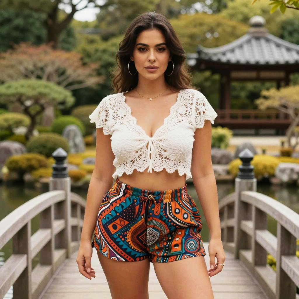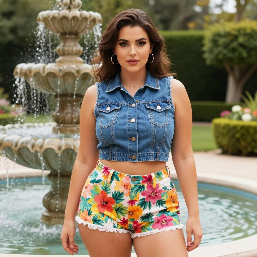 A curvy woman in casual streetwear, wearing a cropped olive green utility jacket over a grey crop top and high-waisted camouflage shorts, hoop earrings glinting in the light, stands confidently by a serene waterfall in a tranquil garden, captured in a vibrant sunrise studio style. Sexy. Pretty face and beutiful eyes
