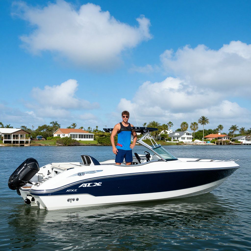 A man stands confidently aboard a sleek 2020 Atx Surf Boats 22 Type-S, navigating calm waters under a vibrant blue sky dotted with fluffy clouds, with a scenic shoreline featuring palm trees and houses in the background.