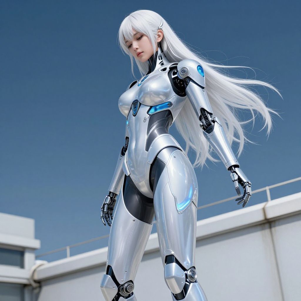 This is a CGI image featuring a stunning, futuristic, anime-style woman with long, white hair. She wears a sleek, silver and black robotic bodysuit with blue accents, highlighting her curvy, athletic physique. Her skin is fair, and her expression is neutral. The background shows a clear, blue sky and a white, industrial rooftop. Her robotic limbs and joints are visible, adding a cybernetic element to her appearance. The image has a high-tech, sci-fi aesthetic with a focus on her futuristic design and the contrast between her organic hair and mechanical suit.