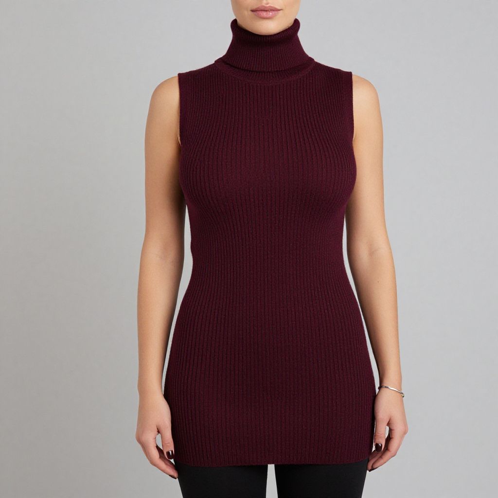 Photograph of a woman with light skin wearing a sleeveless, high-neck, ribbed, dark maroon turtleneck dress and black pants,