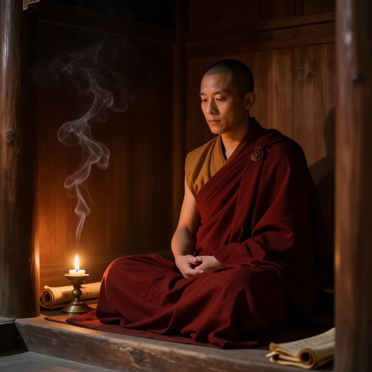 Solitary monk seated inside a simple wooden temple room, candlelight flickering nearby, ancient scrolls and incense smoke swirling around, rich textures of fabric and wood, quiet atmosphere of deep meditation and spiritual focus, highly detailed artwork