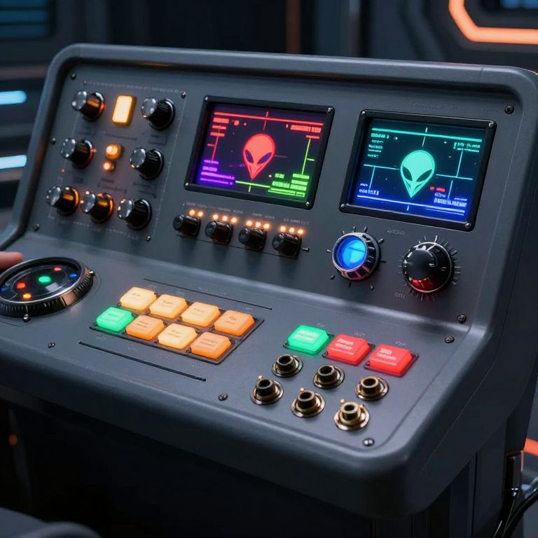 A futuristic alien spacecraft control panel with colorful displays, knobs, switches, LEDs, dials, buttons, and 1/4 inch jacks, set against a dark background.
